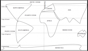The version show here uses the antimeridian as the central Meridian, with Antarctica detached.